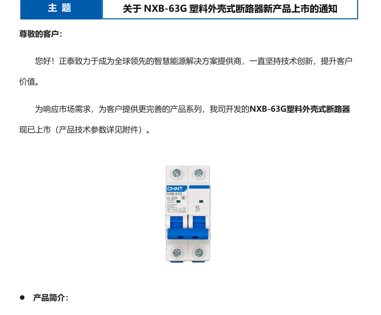 关于 NXB-63G 塑料外壳式断路器新产品上市的通知