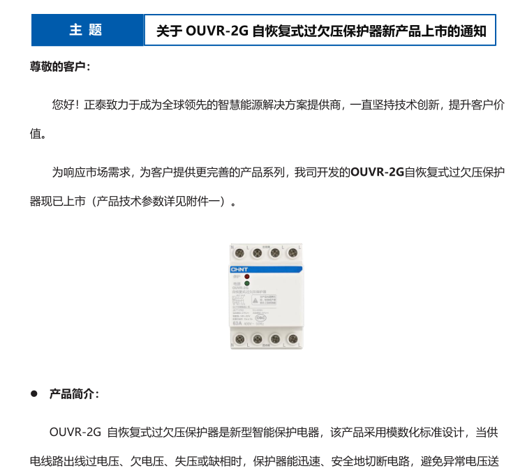 关于 OUVR-2G 自恢复式过欠压保护器新产品上市的通知