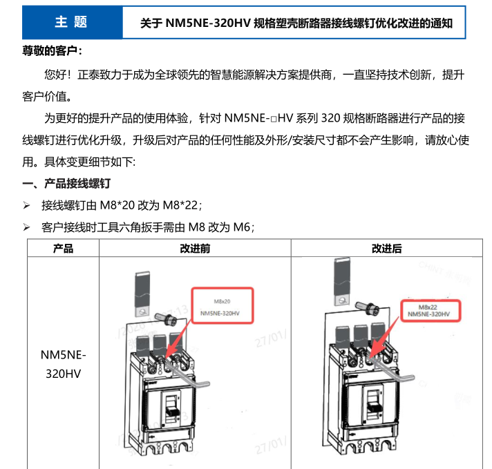 关于 NM5NE-320HV 规格塑壳断路器接线螺钉优化改进的通知
