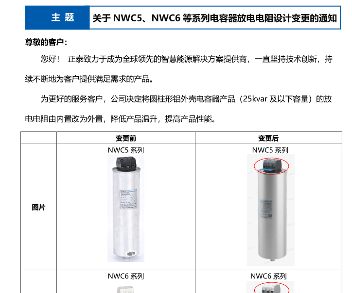关于 NWC5、NWC6 等系列电容器放电电阻设计变更的通知