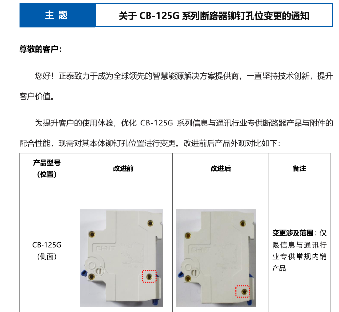 关于 CB-125G 系列断路器铆钉孔位变更的通知
