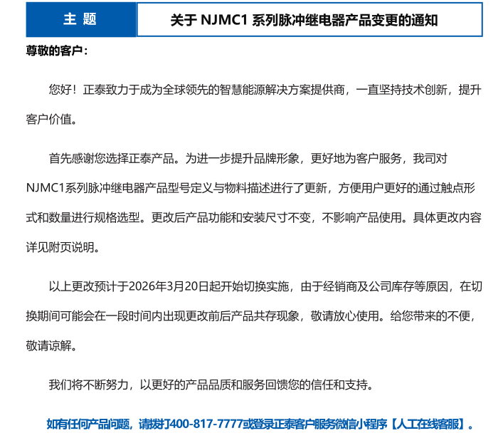 关于 NJMC1 系列脉冲继电器产品变更的通知