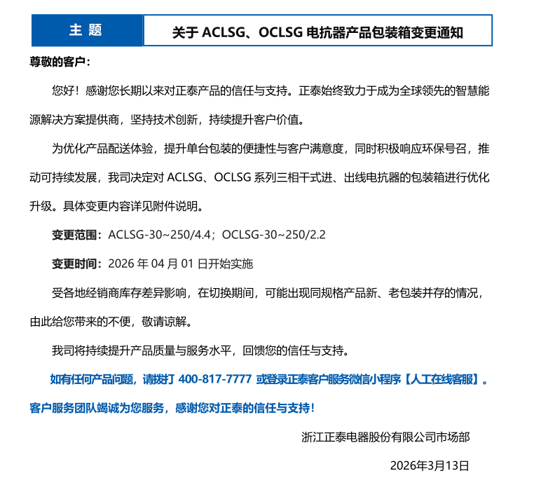 关于 ACLSG、OCLSG 电抗器产品包装箱变更通知