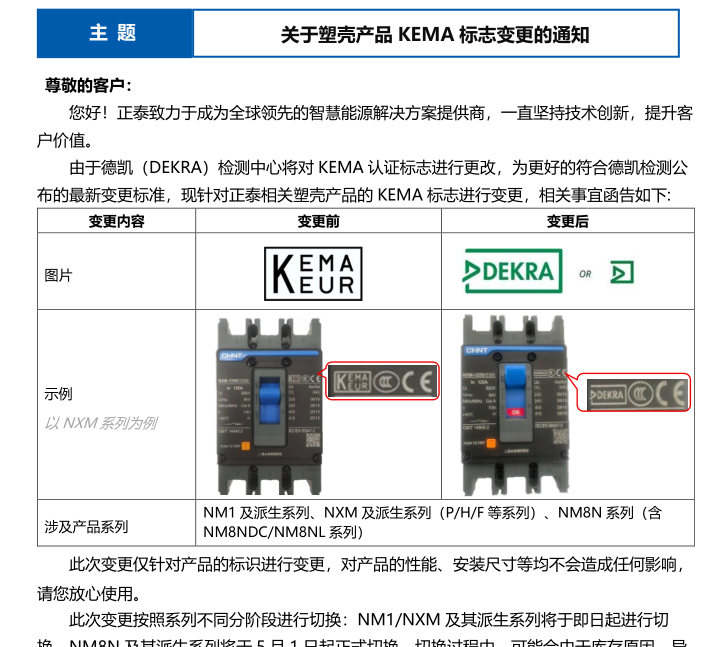 关于塑壳产品 KEMA 标志变更的通知