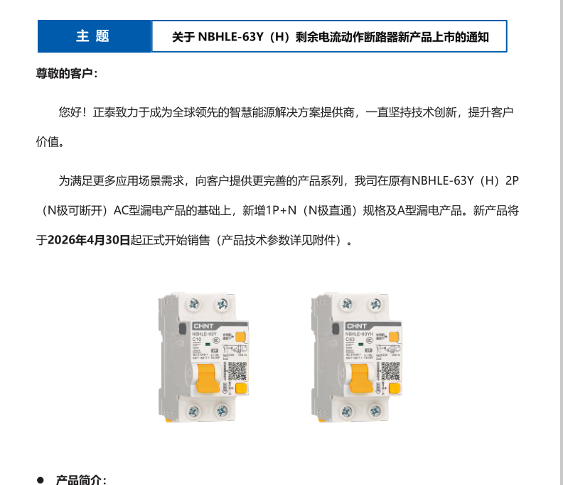 关于 NBHLE-63Y(H)剩余电流动作断路器新产品上市的通知