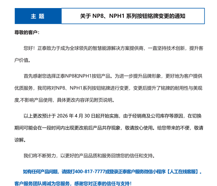关于 NP8、NPH1 系列按钮铭牌变更的通知