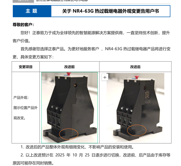 关于 NR4-63G 热过载继电器外观变更告用户书
