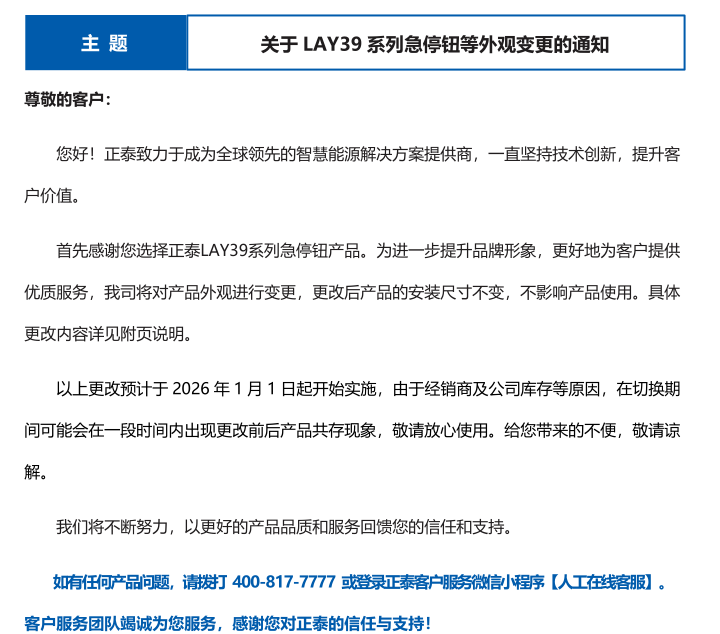 关于 LAY39 系列急停钮等外观变更的通知