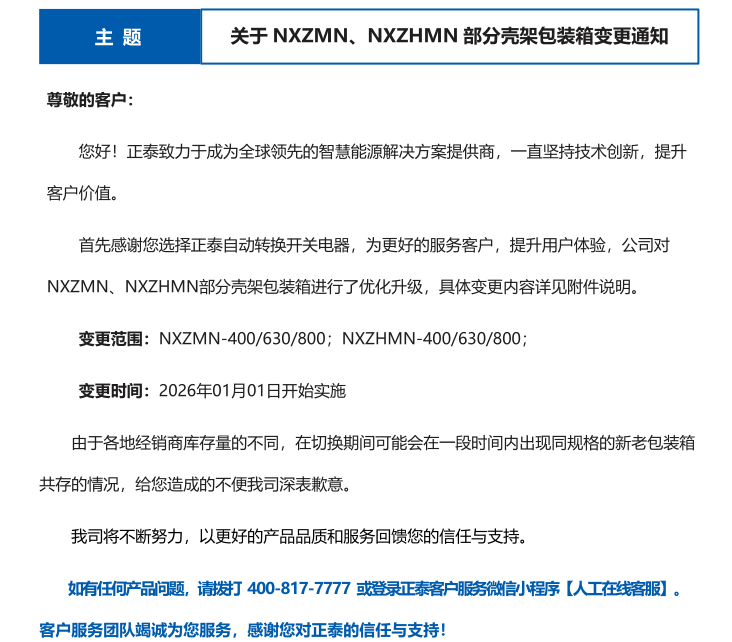 关于 NXZMN、NXZHMN 部分壳架包装箱变更通知