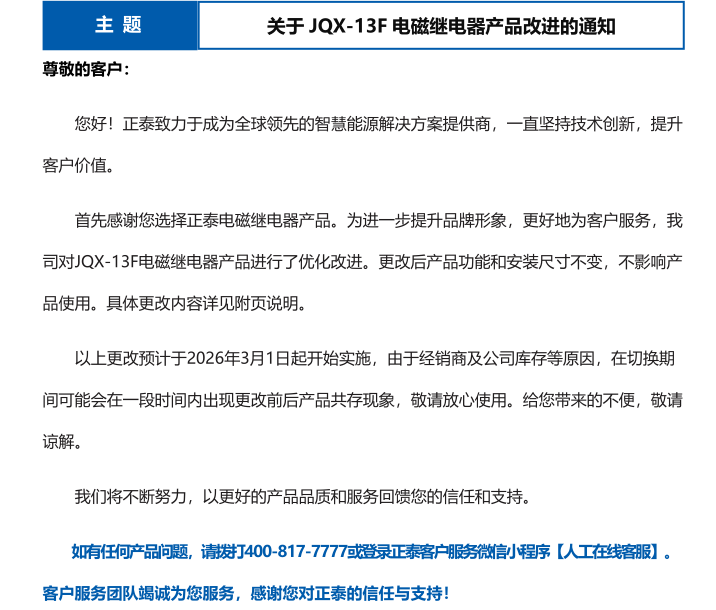 关于 JQX-13F 电磁继电器产品改进的通知